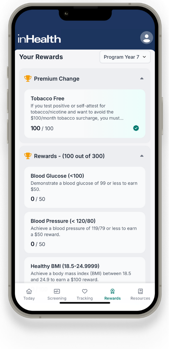 Every employer’s wellbeing program is different, but with the inHealth: Wellbeing app, you can track your progress and see what else you can do to earn even more!