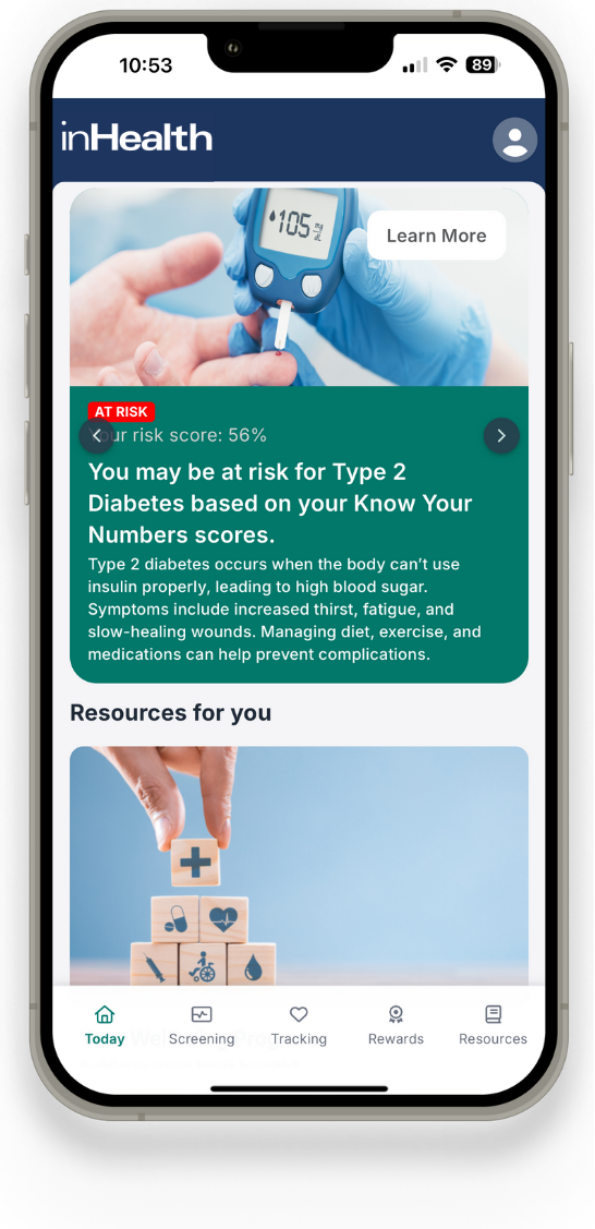 The inHealth: Wellbeing app gives you convenient access to your company’s wellbeing program, the tools to track your health, and a library of resources for all the dimensions of wellbeing and care conditions.